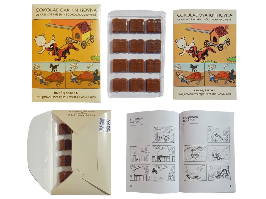 Neben Schokolade enthält das ORIGINALE BUCH: Hund Rek, die Geschichte „Es waren einmal zwei Hunde“ und Pferdchen Hop