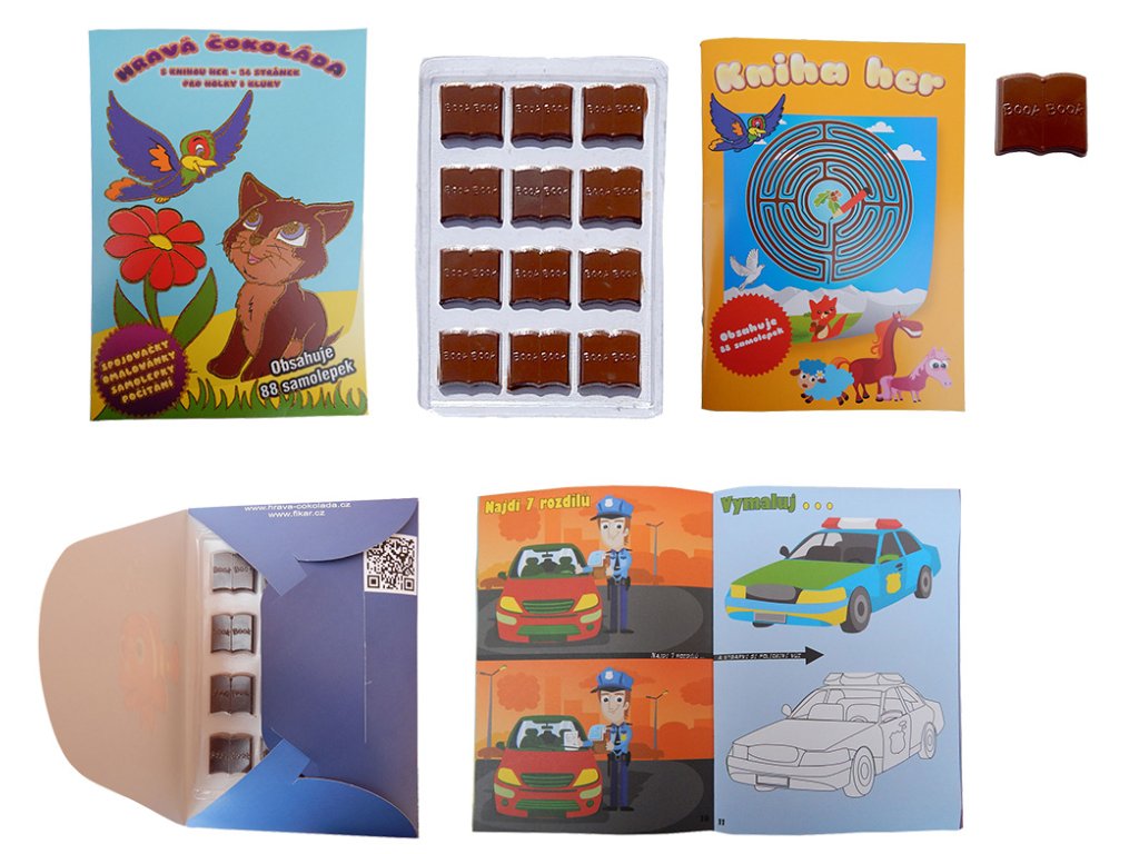 Das Produkt enthält: Schokolade, ein Buch zum Ausfüllen für Kinder, Aufkleber