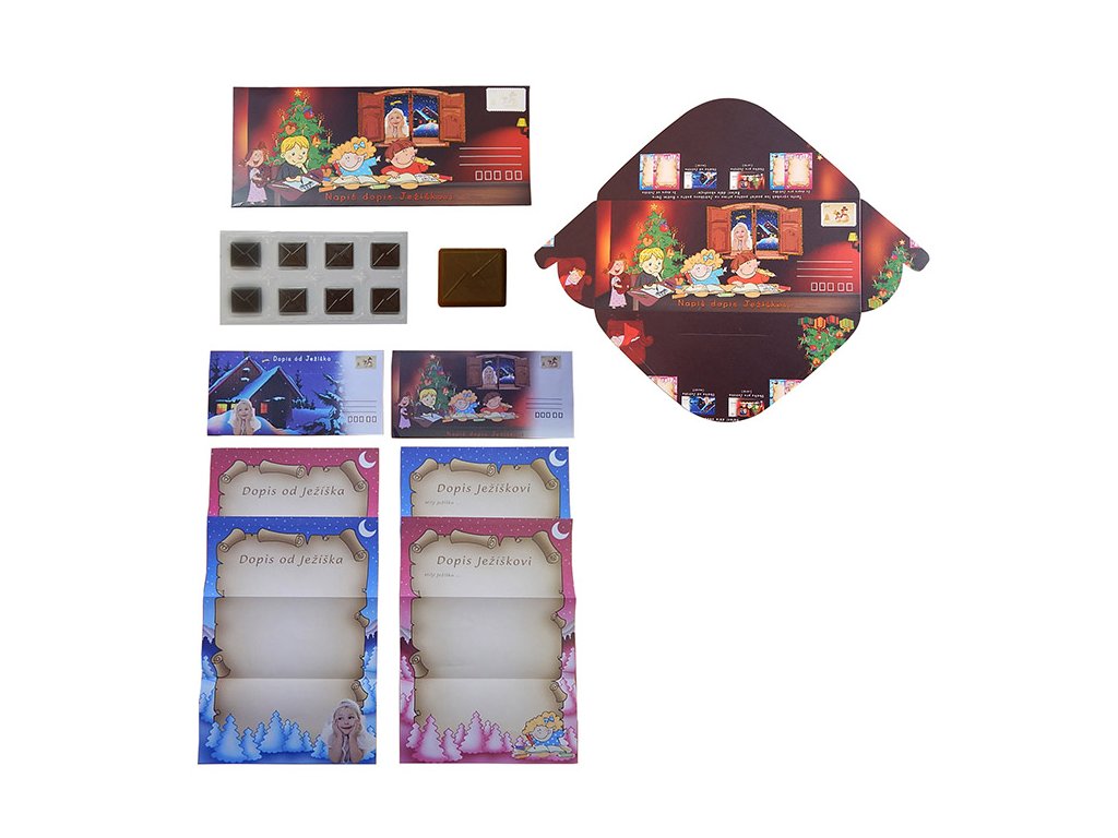 - Eine stilvolle „Hülle“ im Motiv eines Briefes an den Weihnachtsmann, darin angenehme Stücke belgischer Milchschokolade mit einem Gewicht von 60 g